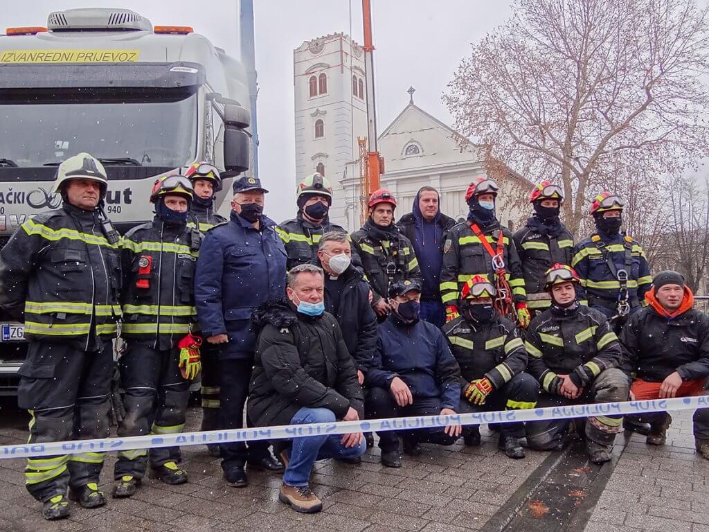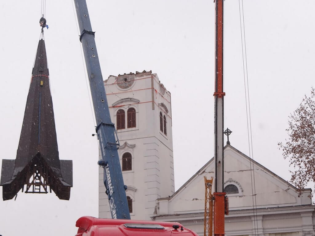 Danima su trajale opsežne pripreme za skidanje krova sa zvonika sisačke katedrale koja je teško stradala u potresu. Krov je konačno skinut danas oko podne. Kapu visoku 14 metara težine oko 15 tona uklonili su vatrogasci. Sljedeća faza bit će spuštanje zvona, dok će se zvonik morati u narednim danima rastaviti ciglu po ciglu.