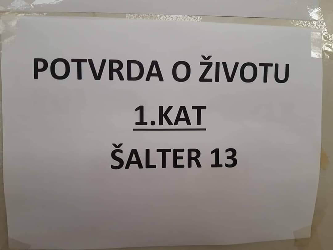 Jedan od najbizarnijih dokumenata u “paralelnom svemiru” mirovinskog sustava ne prestaje zabavljati korisnike društvenih mreža. Jedna od takvih objava osvanula je danas na Facebook stranici “Meanwhile in Croatia” (U međuvremenu u Hrvatskoj). Fotografija je snimljena u Slavonskom Brodu, a objavljena uz šaljivu napomenu da umrlima potvrde o životu – ne izdaju.