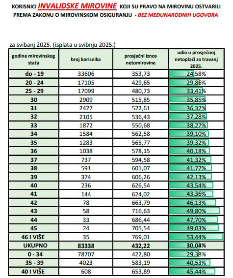 Dalje je naveden broj korisnika invalidske mirovine za svaku pojedinu godinu staža od 30 do 45 godina. Pojedinačno gledajući, najviše je osoba koje dobivaju invalidsku mirovinu radilo 30 godina. Ukupno ih je 2.909, dok im je prosjek mirovine 515 eura. Isto tako, mnogo je onih koji imaju 31 godinu radnog staža. Prosječna mirovina za njih iznosi 522 eura, a korisnika je 2.427. Najmanje je onih koji su radili 45 godina, točnije samo 24 osobe. Njihova mirovina prosječno iznosi 405 eura.