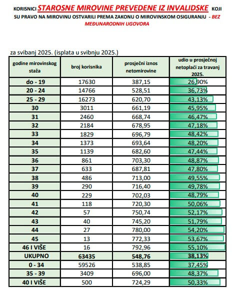 Umirovljenika čije su invalidske mirovine prebačene u starosnu ukupno je 63.435, prema podacima Zavoda za mirovinsko osiguranje iz svibnja. Prosječna mirovina iznosi 548 eura i čini 38 posto udjela u plaći. Prosjek starosnih mirovina koje su prevedene iz invalidskih za 116 eura veći je nego prosjek invalidskih bez međunarodnih ugovora. Inače, udio mirovine u plaći, prema posljednjim podacima, iznosi 44,8 posto, o čemu smo pisali ovdje.