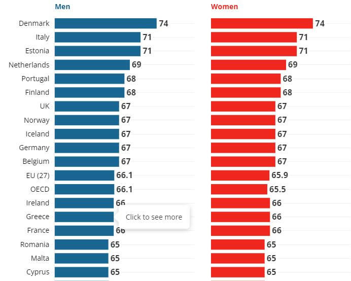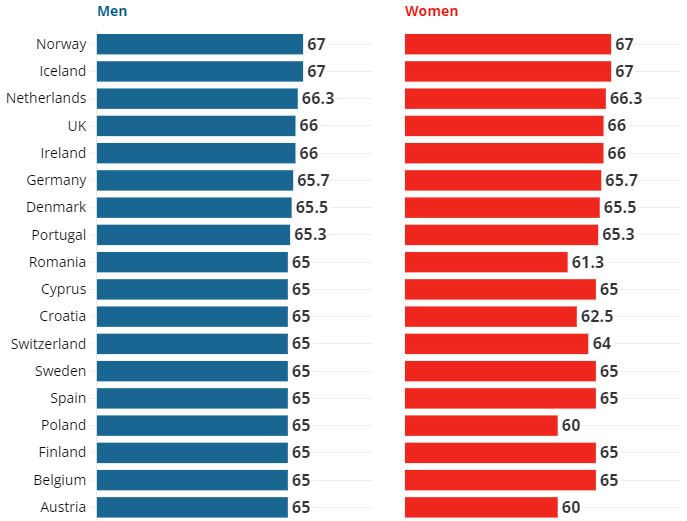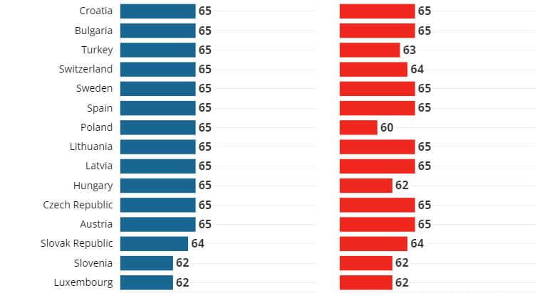 Kao što se može vidjeti i u tablici ispod, najčešća životna dob u kojoj žene i muškarci mogu otići u mirovinu je 62 godine.