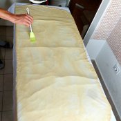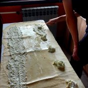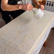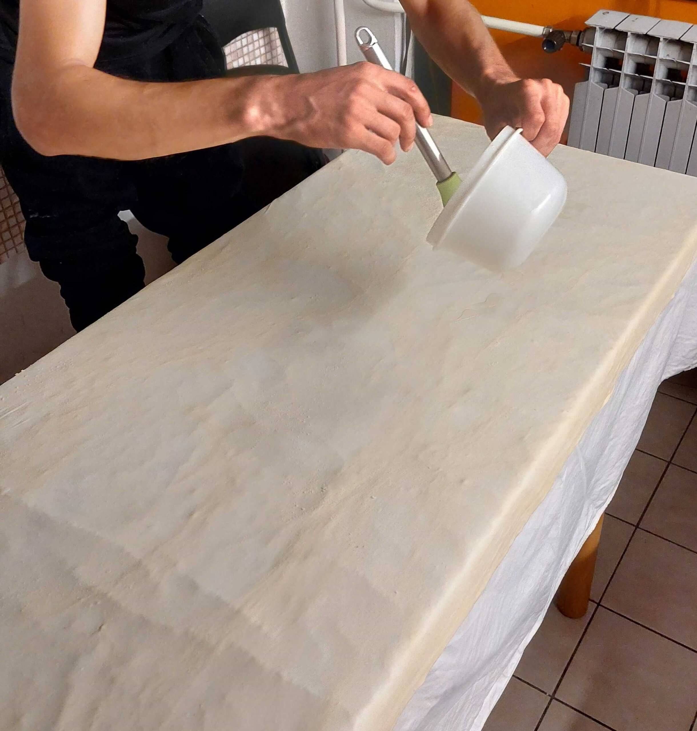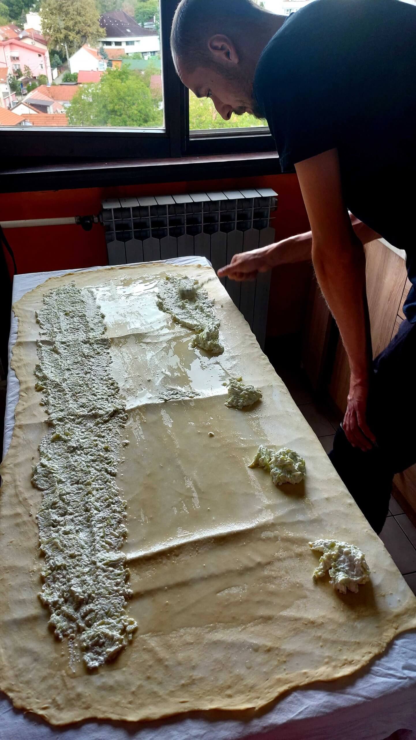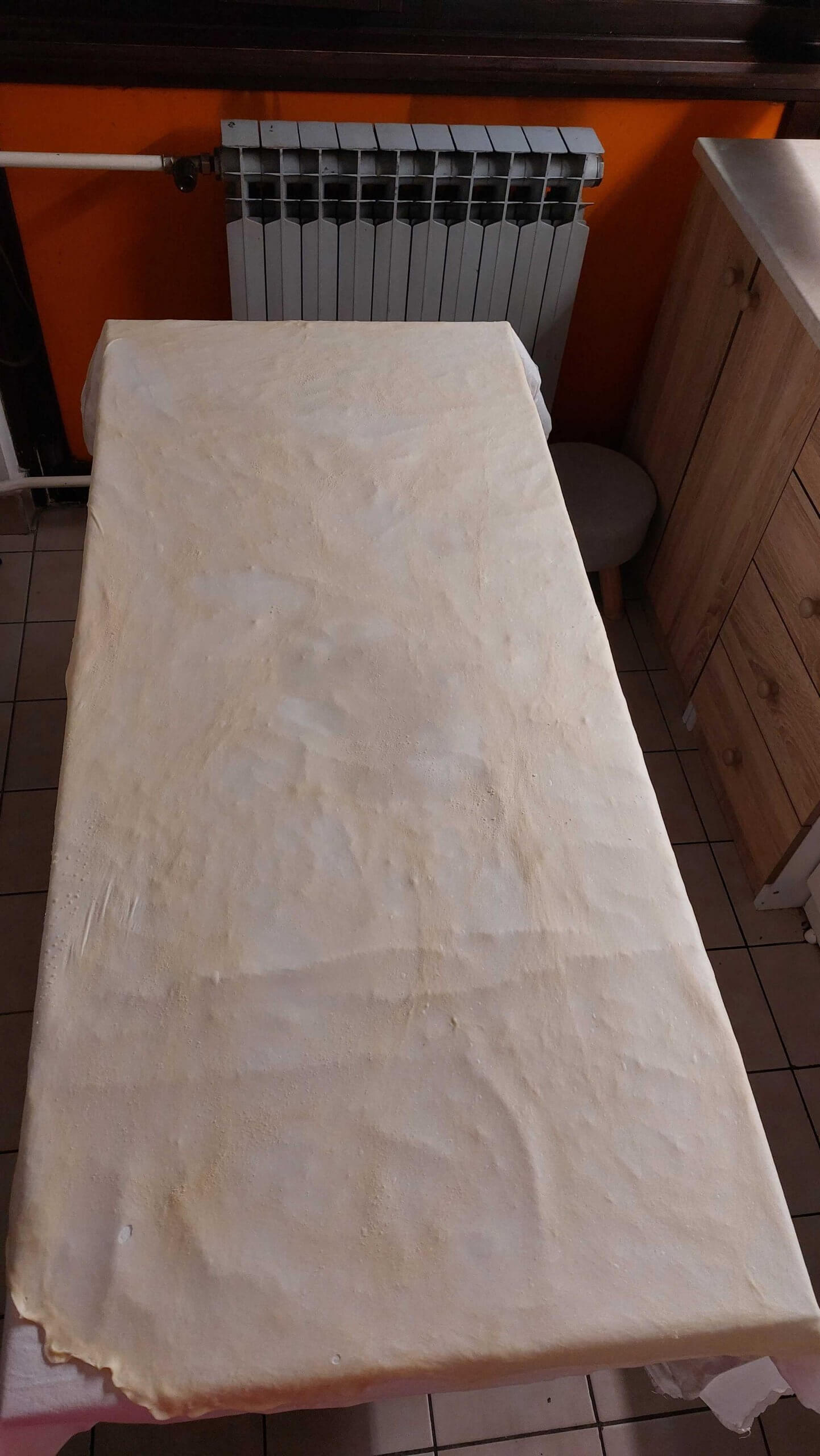 Trebat će vam veća plahta koju ćete pobrašniti po sredini i ondje staviti tijesto koje ste izvadili iz posude s uljem. Lagano pritisnuti tijesto u ovalni oblik, pobrašniti tijesto i malo ga razvaljati za početak. Kada ste ga razvaljali na otprilike 1-2 centimetra debljine, znači ne previše, krenite ga razvlačiti s rukama od ispod u oblik stola. Cilj je da tijesto bude otprilike podjednako razvučeno, preko cijelog stola, bez rupa i da na kraju dobijete razvučeno tijesto koje je dosta tanko i skoro pa prozirno. Naravno, neće vam svaki puta ispasti savršeno tako da se nemojte gristi ako vam tijesto pukne ili ima grudice i rupice, kada stavite nadjev i ispečete, bit će jednako fino. Svaki puta će vam ići sve bolje tako da nemojte biti samokritični, vježbom dolazi i savršenstvo.