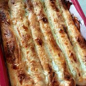 Prerezati nožem tijesto u sredini između tih ‘roladica’ i svaku posebno još zarolati da se pokupi taj višak odrezanog tijesta. Nauljiti protvan i posložiti tijesto kao na fotografiji. Premazati vrhnjem i peći u zagrijanoj pećnici na 180 stupnjeva dok ne dobije zlatno-smeđu boju, kao na slici.