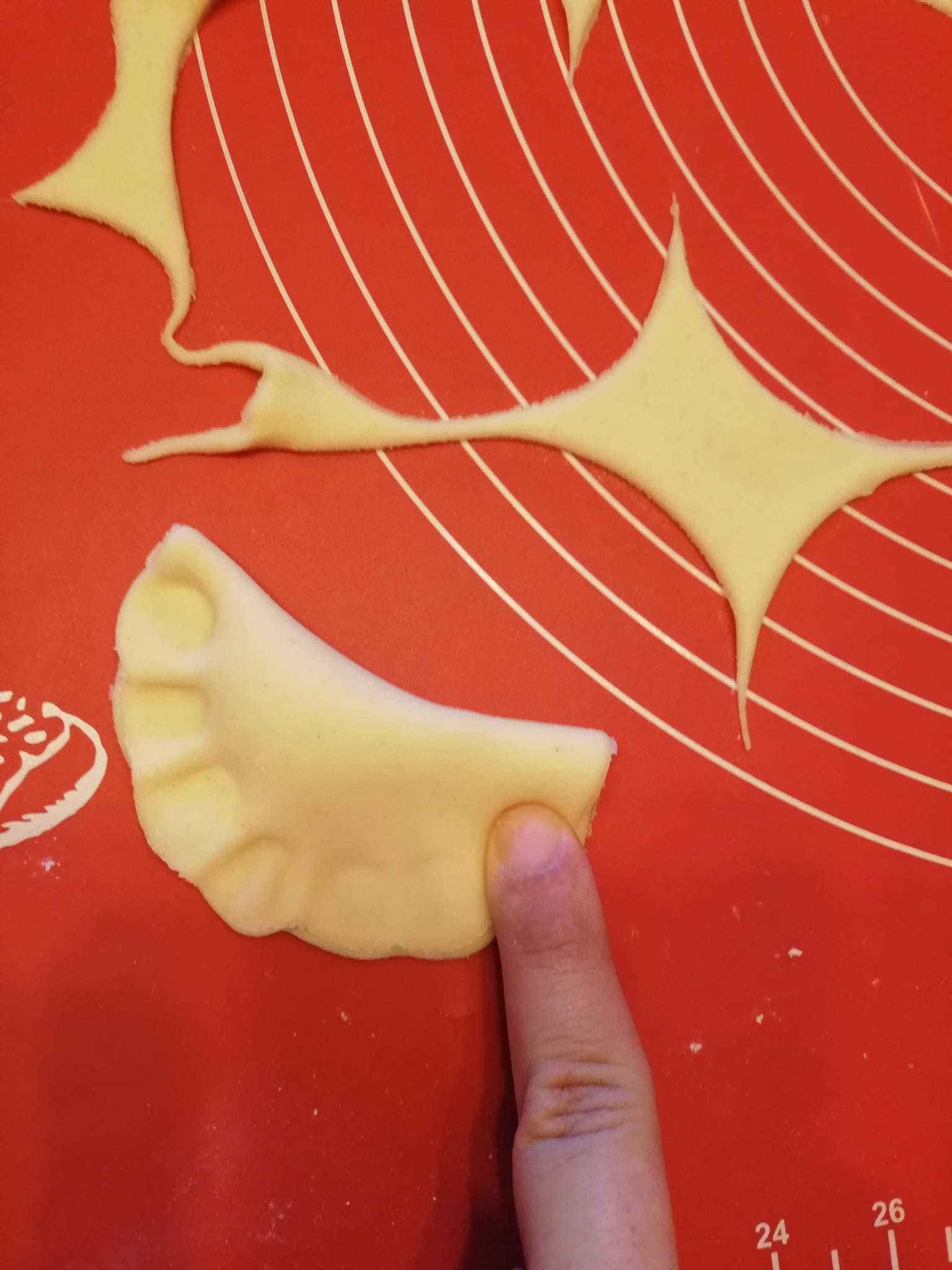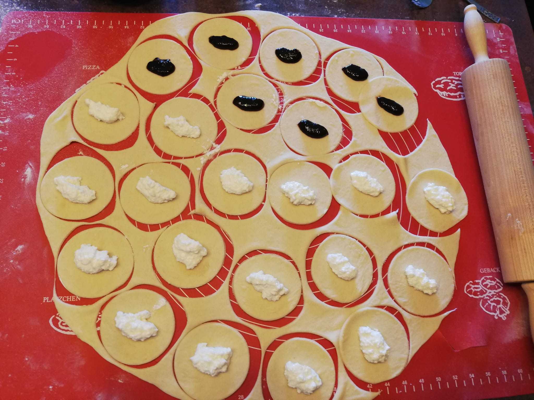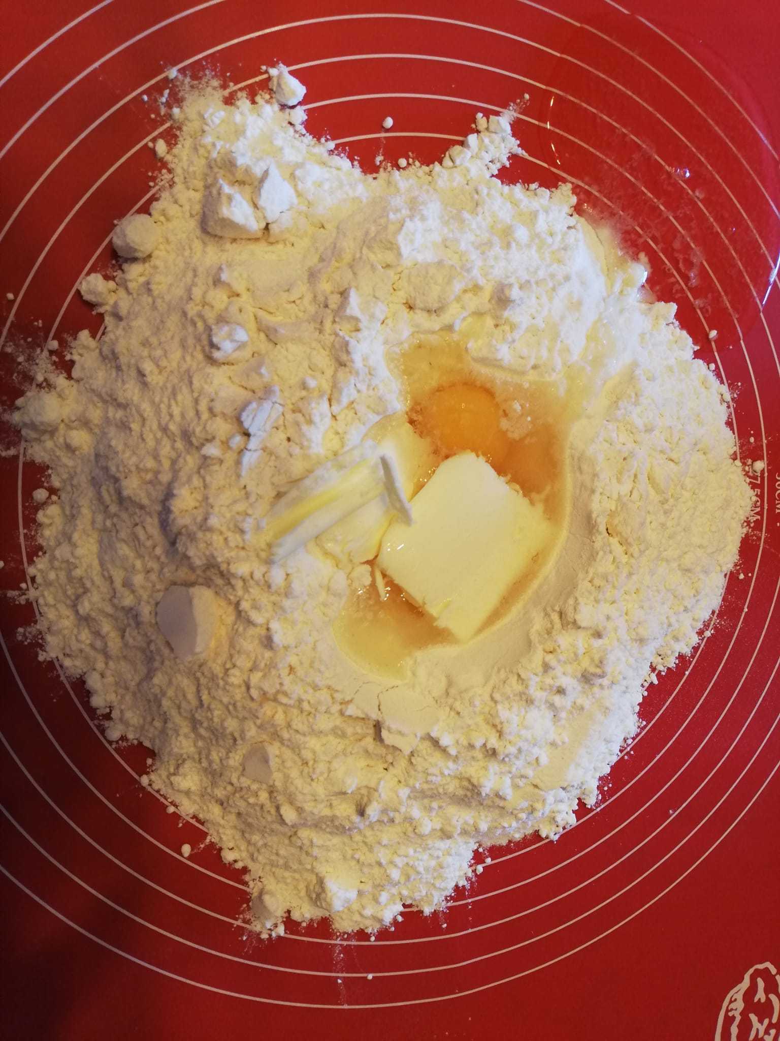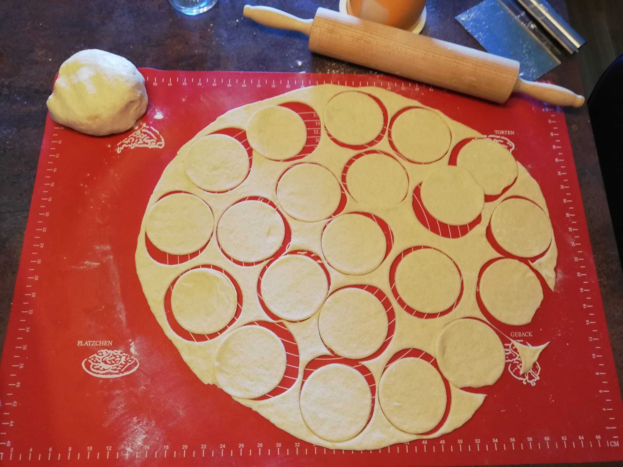 Na podlogu prvo stavite brašno i sol i napravite u sredini malo mjesta. Ovdje stavite jaja i maslac koji je prethodno bio na sobnoj temperaturi. Zamijesite tijesto uz dodavanje vode po potrebi. Kada ste dobili glatko tijesto, podijelite ga na dva jednaka dijela. Površinu pobrašnite i na nju stavite jedan dio tijesta, a onda i njega malo pobrašnite. Razvaljajte tijesto da bude tanko, ali ne pretanko. Idući korak je rezanje krugova pomoću čaše.