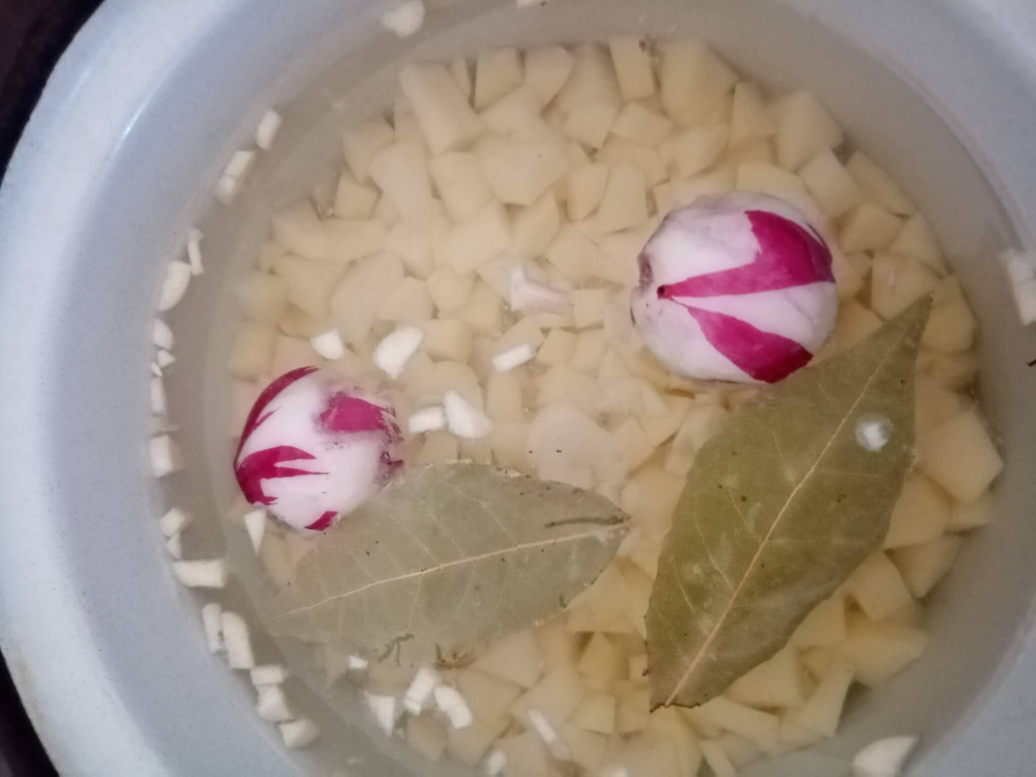- Dodati glavicu luka, dva češnja bijelog luka, lovor, biber i sol. Kuhati dok krumpir ne bude mekan
