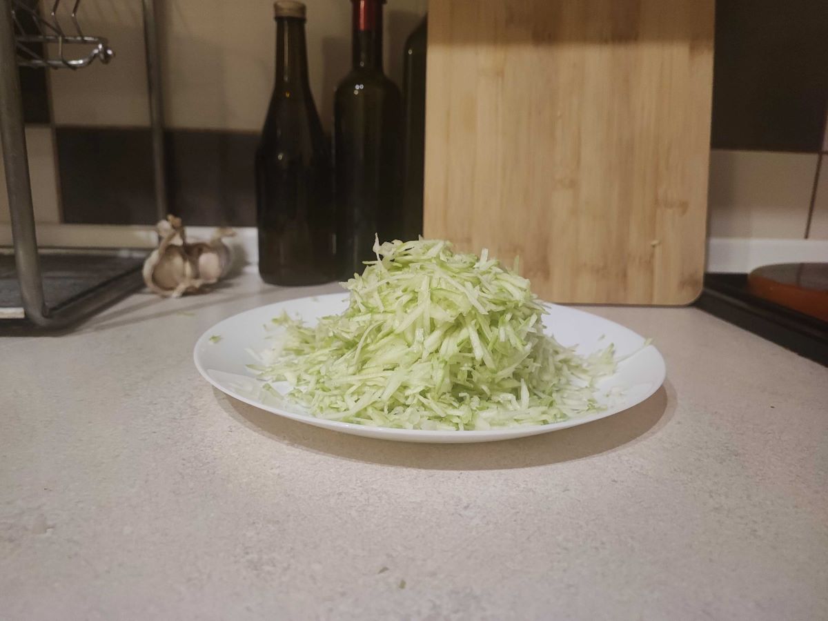• Tikvicu očistiti i naribati. Naribanu tikvicu posoliti i ostaviti 15 minuta da pusti vodu i gorčinu. Nakon toga ocijediti tikvicu i baciti vodu. Sol koja je ostala u tikvicama je dovoljna, ali ako netko voli slanije, može dodati još soli.