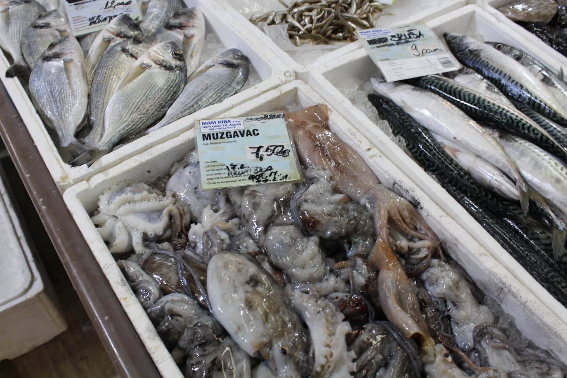 Na Dolcu smo pronašli slično voće i povrće, po sličnim, a u nekim slučajevima i većim cijenama. Osim toga, zavirili smo i u unutarnji dio i provjerili cijene mesa i riba. Tako ćete recimo za kilogram lignji morati izdvojiti 25 eura.