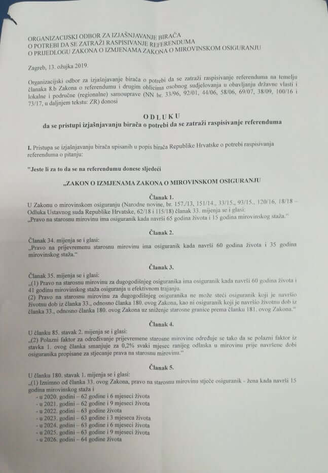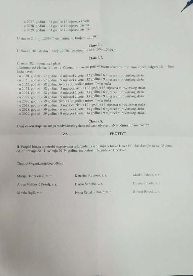 “Referendumsko pitanje, bude li usvojeno, postavit će dob za odlazak u mirovinu na 65 godina. Drugim riječima, poništit će se planirano podizanje uvjeta za odlazak u mirovinu na 67 godina starosti. Time će se i prijelazno razdoblje za stjecanje prava na starosnu mirovinu sa 65 godina za žene produljiti do 2029. godine”, stoji u pojašnjenju referendumskih pitanja.