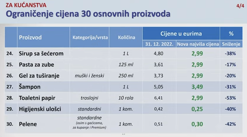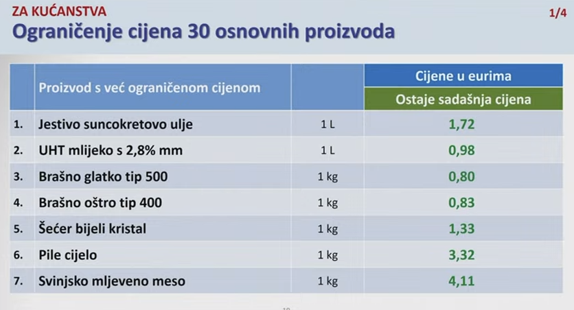 Popis svih 30 proizvoda s ograničenom cijenom možete pogledati u Vladinim tablicama, a među njima se nalazi sedam proizvoda čije je cijene Vlada već ranije zamrznula; suncokretovo ulje, mlijeko, brašno, šećer, pile i svinjsko mljeveno meso.