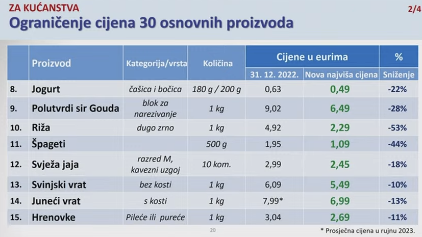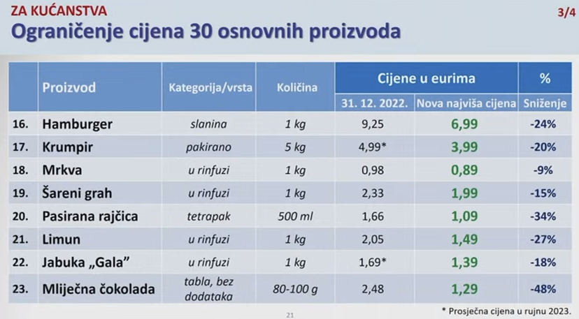 Premijer Andrej Plenković je, podsjetimo, prilikom predstavljanja ove mjere rekao kako je riječ o uštedi od 23,49 eura kada bi netko kupio košaricu sa svim ovim proizvodima. Cijena kompletne košarice prije ograničavanja je bila 99,68 eura, a nakon 76,19 eura. Međutim, takva košarica s 30 artikala ne obuhvaća sve proizvode koje je potrebno kupiti.