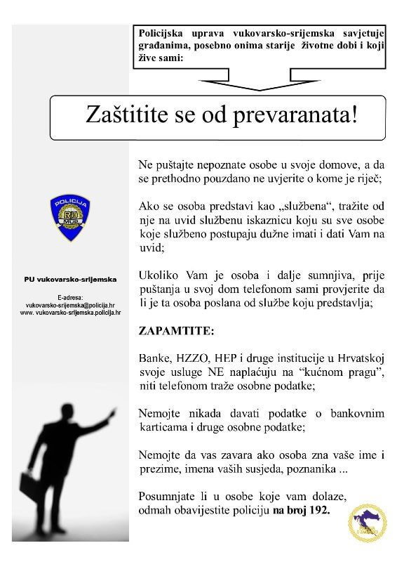 – Građani starije životne dobi često su žrtve kaznenih djela prijevare, a razlozi tomu su odmakla životna dob, samostalno stanovanje te neupućenost i nepažnja. Upoznali smo ih s načinima prevara, pri čemu im je naglašena važnost da nepoznate osobe nikako ne puštaju u svoje domove, posebno kada nemaju nikog drugog od ukućana. Naime, prilikom namjere ulaska nepoznatih osoba u dom svakako od njih treba zatražiti službene iskaznice te putem telefona provjeriti jesu li zaista zaposlenici u tvrtkama za koje se predstavljaju, priopćili su iu Policijske uprave vukovarsko-srijemske.