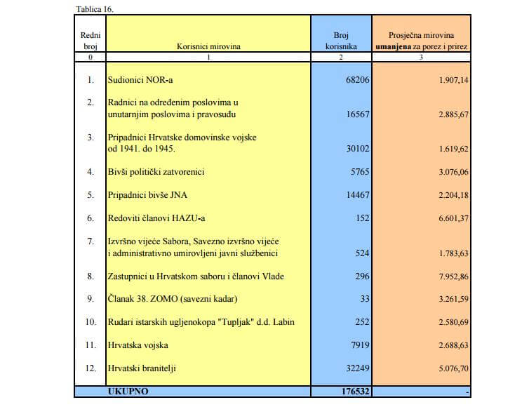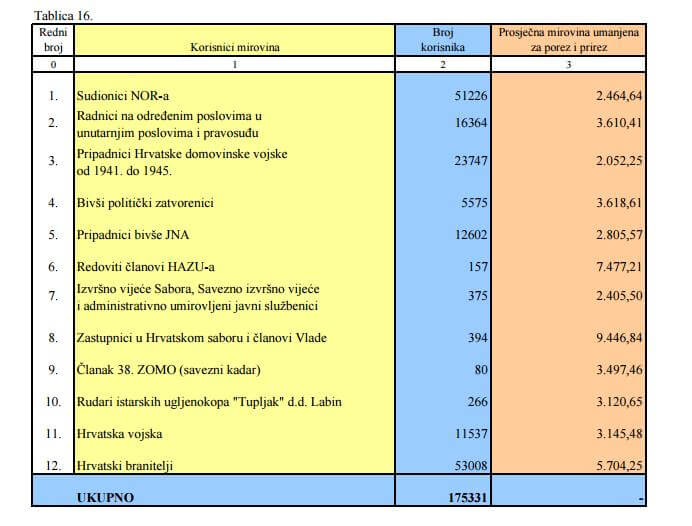Prema najnovijim podacima HZMO-a iz listopada, po brojnosti iza hrvatskih branitelja dolazi 14.399 djelatnih vojnih osoba sa 2.657 kuna, a odmah iza su sudionici Narodnooslobodilačkog rata (NOR), njih 13.772 s prosječnom mirovinom 2.731 kunu. Među „povlaštenim“ mirovincima je i 9.339 ovlaštenih službenih osoba u tijelima unutarnjih poslova i pravosuđa s više od 4.000 kuna mirovine te 6.997 policijskih službenika, ovlaštenih službenih osoba pravosuđa te službene osobe s posebnim dužnostima i ovlastima u sigurnosno-obavještajnom sustavu HR. Tu su i 272 radnika na poslovima razminiranja koji primaju prosječnu mirovinu 5.163 kune. Pripadnika Hrvatskog vijeća obrane je 6.803, pripadnika Hrvatske domovinske vojske (HDV) od 1941. do 1945. u mirovini je 6.076 s mirovinom od 2.333 kune, umirovljenih bivših političkih zatvorenika je 3.259 koji primaju 3.765 kuna mirovine, a pripadnika bivše JNA je ukupno 6.771 te primaju u prosjeku nešto više od 3.000 kuna. A mirovinu po posebnim propisima prima i 36 bivših službenika u saveznim tijelima bivše SFRJ.