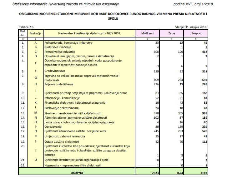 Da Hrvatska nema razvijenu praksu rada uz zadržavanje mirovine, pokazuje i statistika prema kojoj je po ugovoru o radu na četiri sata dnevno zaposleno svega tek nešto više od 4.000 umirovljenika. Ipak, dvostruko je to veća brojka nego samo prije dvije godine, a svakako treba uzeti u obzir da ih još najmanje toliko radi kroz ostale oblike rada, dok ih velik broj koju kunu sa strane zarađuje u “sivoj zoni”.