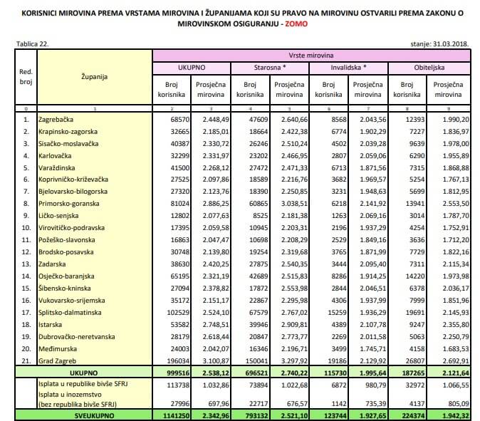 Umirovljenici u većini krajeva Hrvatske imaju prosječnu mirovinu manju od 2.500 kuna. S oko 2.000 kuna mirovinskih primanja najlošije žive starije osobe u Ličko-senjskoj, Požeško-slavonskoj, Međimurskoj i Virovitičko-podravskoj županiji.