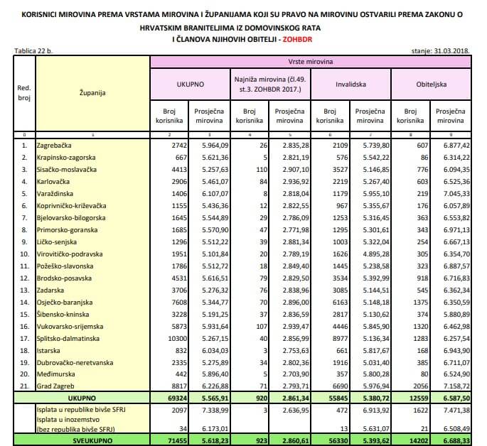 Što se pripadnika Hrvatskoj vijeća obrane tiče, najviše ih je u Zagrebu i Brodsko-posavskoj županiji, po oko 400 umirovljenih. Usporedbe radi, u Međimurskoj županiji stanuje samo jedan umirovljeni HVO-ovac i prima mirovinu od 4.000 kuna.