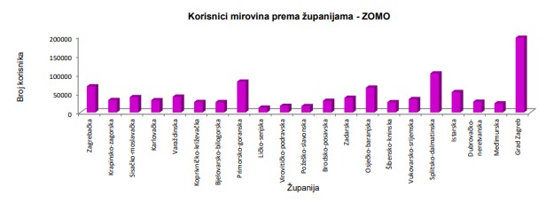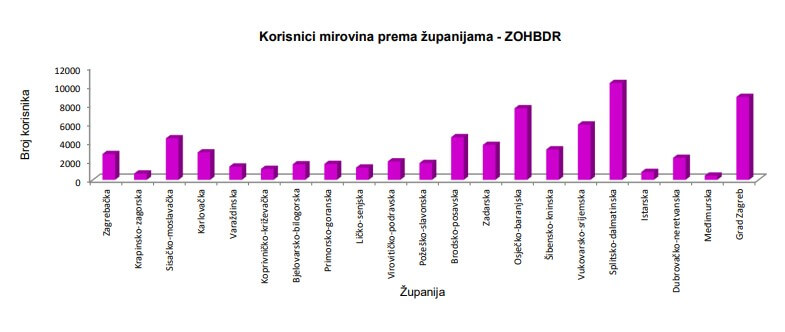 Nakon Grada Zagreba u kojem stanuje petina umirovljenika, njih gotovo 200.000 od ukupno 1,1 onih “običnih”, najveću populaciju penzionera u Hrvatskoj ima Splitsko-dalmatinska županija. Na njezinom je području oko 100.000 umirovljenika, a po brojnosti odmah iza smjestile su se Primorsko-goranska (81.000), Zagrebačka (68.000) i Osječko-baranjska županija (65.000).