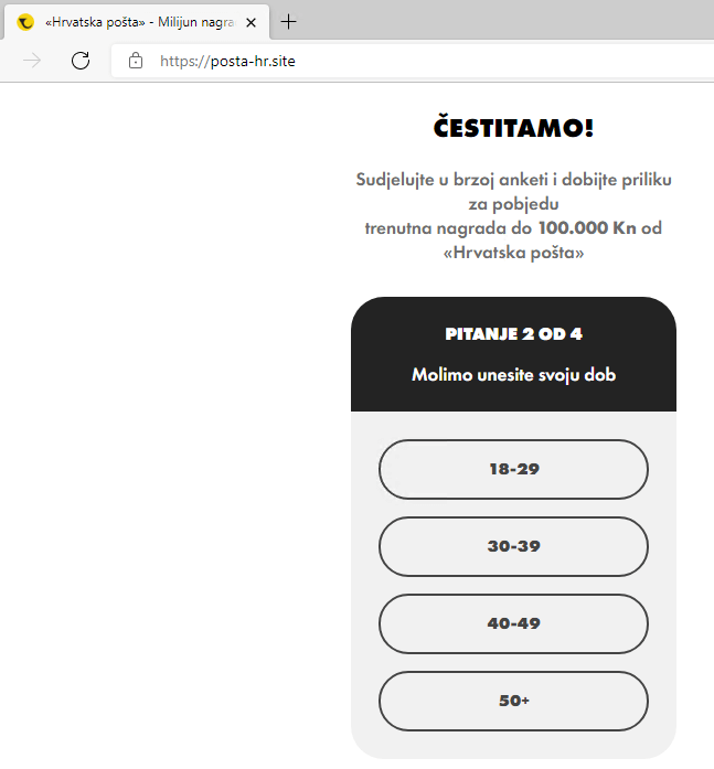 Jedan takav link s lažnom domenom Hrvatske pošte vodi na lažnu Konzumovu anketu i nagradnu igru gdje se korisniku obećaje 50.000 kuna. Ne otvarajte i ne rješavajte, jer bi se prevaranti tako mogli domoći vaših osobnih podataka.