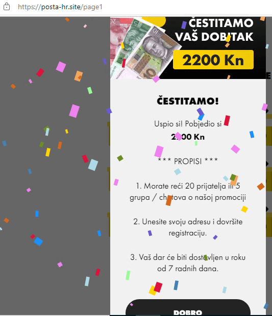 Ako na bilo koju aplikaciju za komunikaciju dobijete poveznicu (link) sumnjivog izgleda koji vodi na zapravo nepostojeću stranicu Hrvatske pošte, ne otvarajte ga. Riječ je, naime, o lažnoj nagradnoj igri u kojoj se nudi novčana nagrada kroz nekoliko jednostavnih koraka, od kojih je jedan i da link podijelite s prijateljima. Svrha prevaranata je domoći se vaših osobnih podataka.
