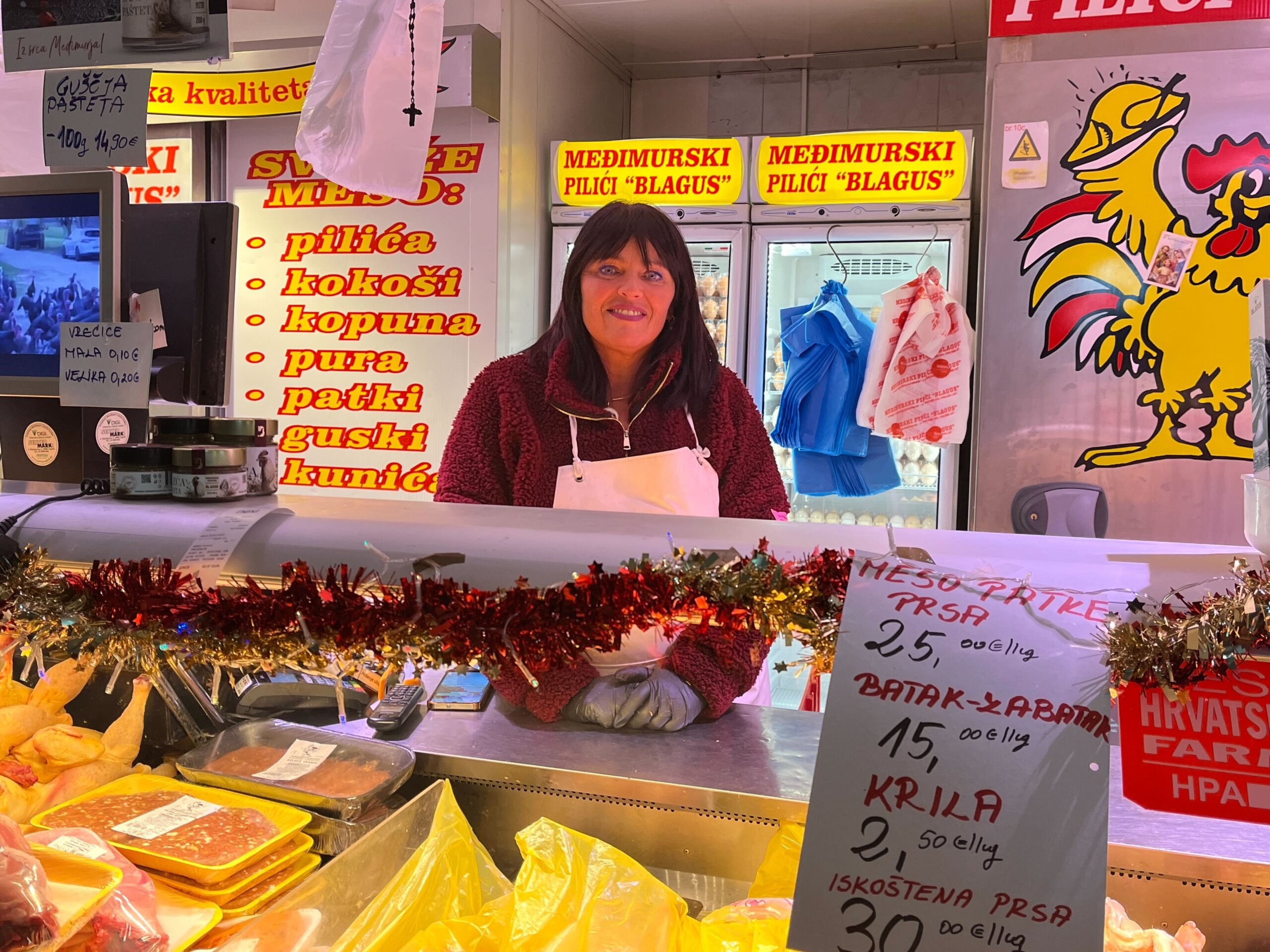 Purica je važan dio blagdanskog stola pa smo prodavačicu Anu pitali po koliko ih ona prodaje. Zagorske purice kod nje su 15,90 eura, dok su međimurske purice deset eura, a race 11,90 eura. Kod gospodina Štefa cijene mesa kreću se od sedam do 20 eura po kilogramu, a najviše se kupuje odojak, janjetina i teletina.