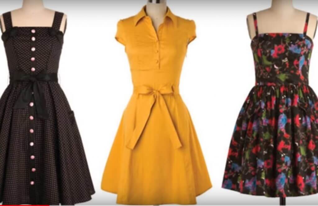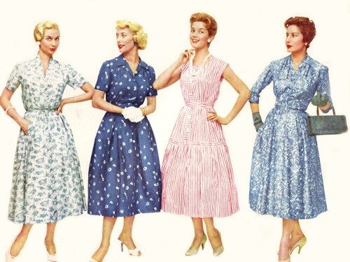 Modne 50-e: Desetljeće glamura iznova je u prvi plan stavilo raskošne haljine i eleganciju, a Diorov je stil nakon početnih odbijanja ipak prihvaćen u svoj svojoj raskoši. Ratno razdoblje zamijenila je gracioznost, a dotjeranost je postala ultimatum. Haljinama se isticala figura pješčanog sata, a ispod stegnutog struka donji dio bio je bogat i pun volumena. Nosile su se raskošne, zvonolike suknje zanimljivih dezena, ali zbog praktičnosti obavljanja raznih poslova žene su prigrlile i jedan usporedni ležerni stil. U njemu nije nedostajalo elegancije jer se struk naglašavao lijepim remenima, a linije su pratile i bokove. Kod kuće su se nosile haljine s pregačom, dok večernje haljine od finih materijala više nisu imale naramenice.