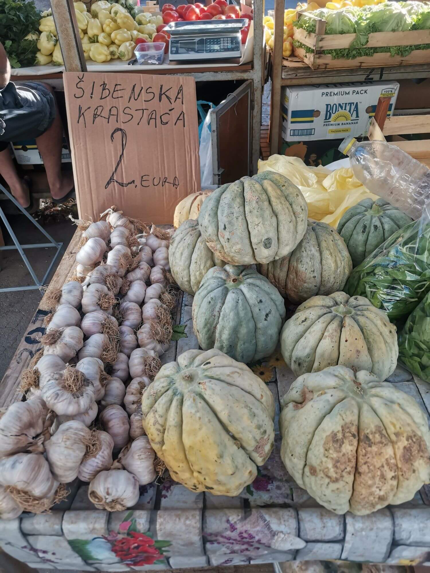 – Evo tu su sada i cate (dinje op.a.) krastače, to je nešto novo u ponudi, starinsko je sjeme. Cate krastače poznate su Šibenčanima, znaju što je to. Dugo ih nije bilo na pijaci, a sada su se opet pojavile. Glavna razlika je da su slađe od obične dinje. Šibenčani me znaju od djetinjstva, kada smo prodavali svoju ribu i zelenjavu. Nema kuće u kojoj me nije bilo, kao dijete bi ljudima ribu nosila. Danas je ovaj euro poremetija svit, ali zapravo nije toliko ni do novca, stvar je najviše u vrućinama. Više je faktora, svatko kupi u centrima gdje im je bliže, uđu u rashlađeno, obave na brzinu i idu dalje, priča Jadranka.