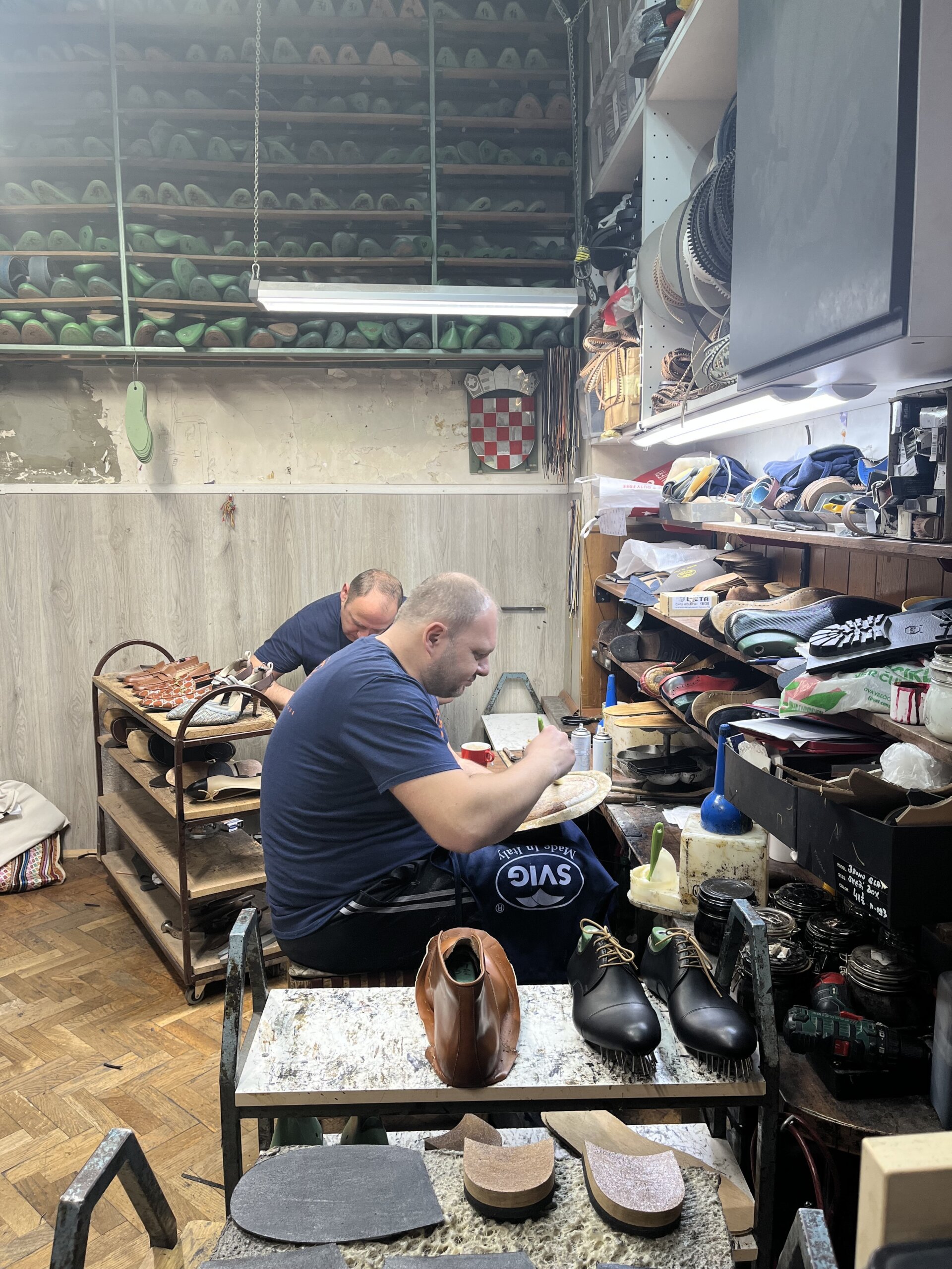 Kako nam je u početku otkrio, zvanje za postolara uopće više ne postoji. Trenutno čeka strane radnike iz Nepala da vidi znaju li raditi kako bi se posao nastavio. Postolar Bruno uskoro će u mirovinu. Objasnio nam je da ima dvije radnice koje se bave krojenjem, no da jedna gospođa ima više od 70 godina, dok druga ima 67. Objasnio je kako je ženski dio posla krojenje kože kako bi se dobili dijelovi. Osim toga, radnice sve spajaju. Zatim, napravljeni dijelovi idu kod dečkiju kako bi se oblikovalo na kalupu i stavilo đon po želji.