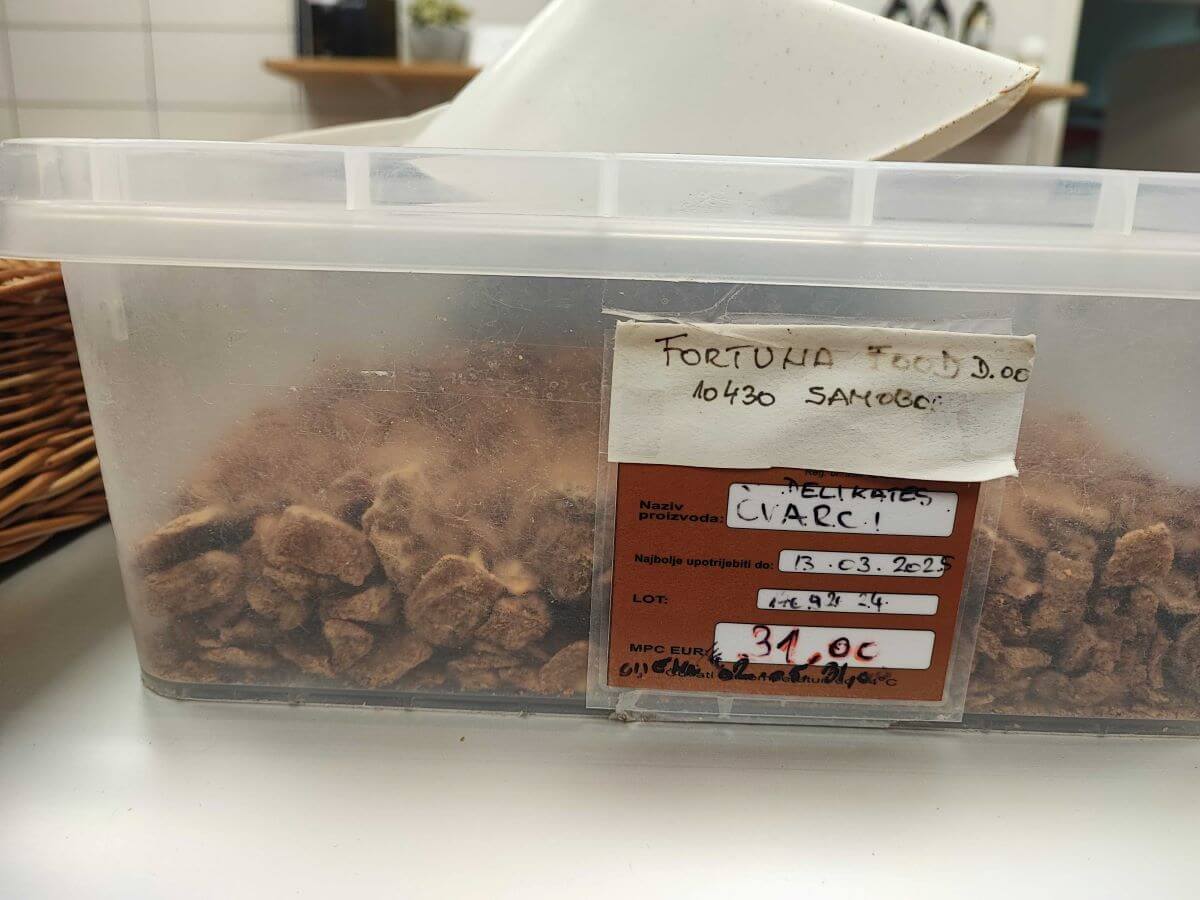 Provjerili smo cijene čvaraka i u jednom domaćem trgovačkom lancu. Kad gledamo po kilogramu, prodaju se za 19,95, 21,16 i 21,45 euro. U ponudi su i premium čvarci koji se prodaju u pakiranju od 90 grama za 4,19 eura, a po kilogramu to iznosi 46,56 eura.