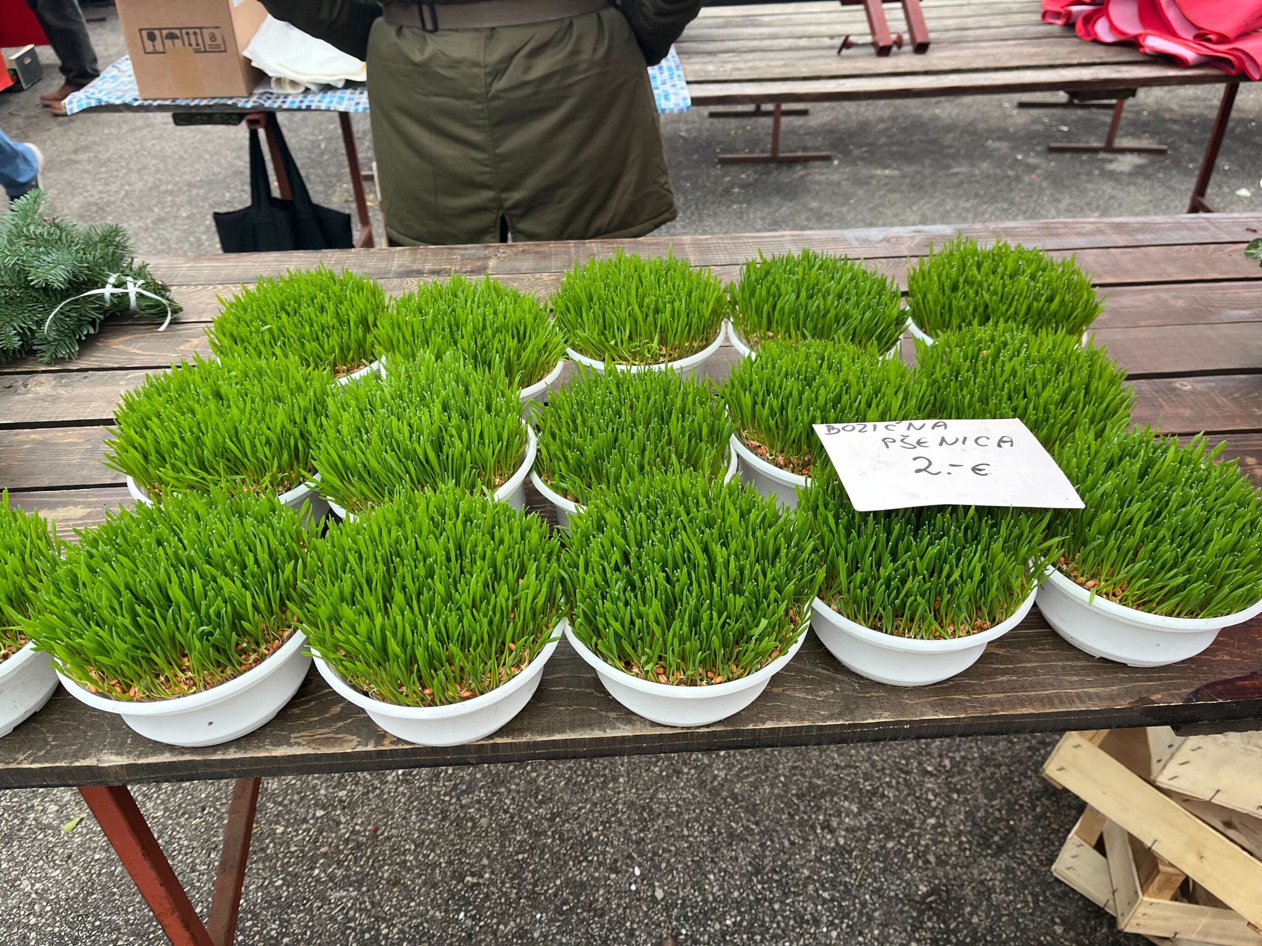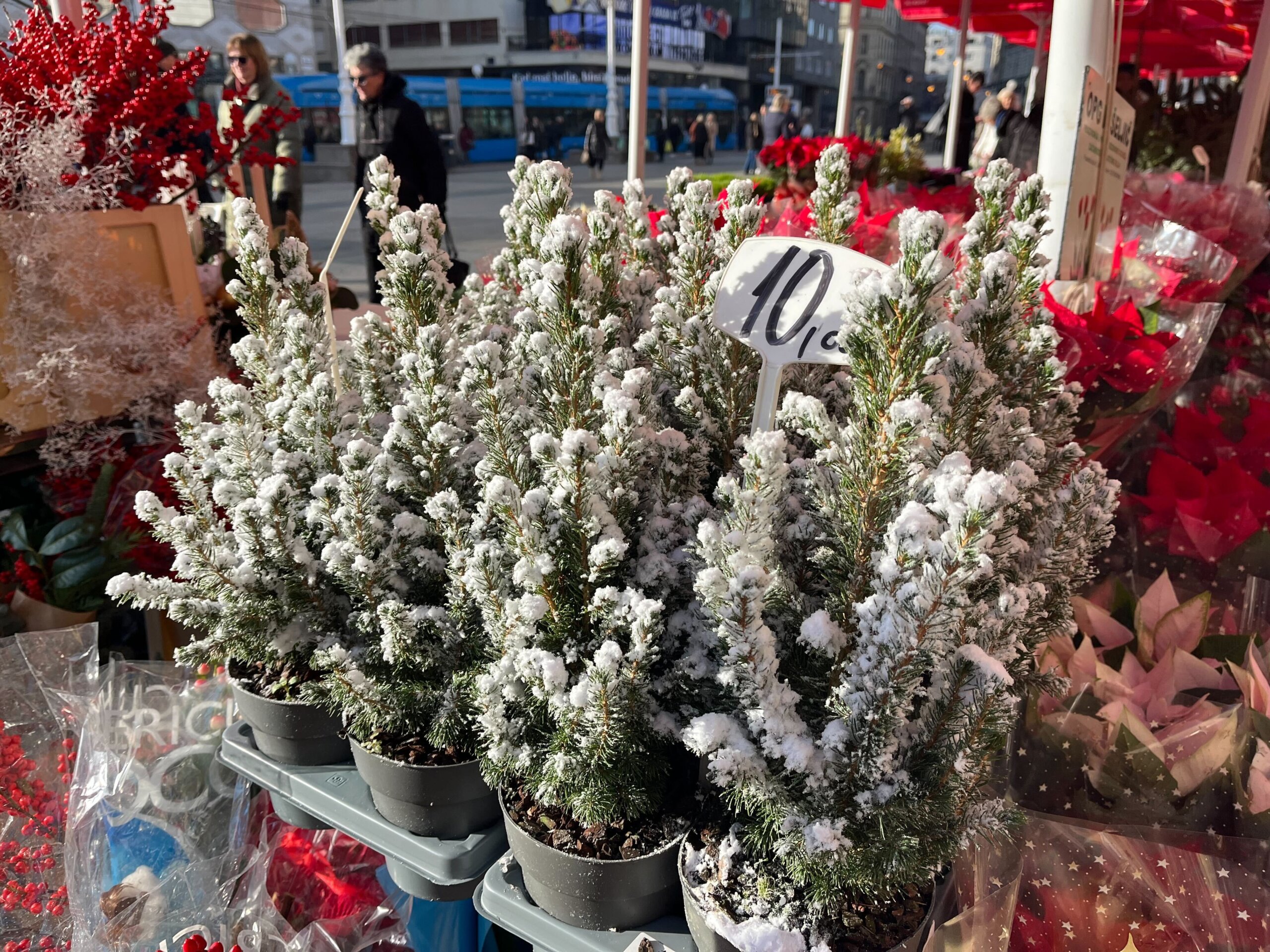 Osim na tržnici Dolac koja je sada izmještena, o čemu smo pisali ovdje, provjerili smo što se nudi na tržnici Kvatrić. Cijene su na obje tržnice dosta slične. Božićna zvijezda na Kvatriću prodaje se po pet eura, dok nešto manje božićne zvijezde od one ‘uobičajene’ veličine vrijede četiri eura. Mnogi ne sade sami, već kupuju pšenicu, a na Kvatriću se ona prodaje za dva eura. Vijenac od borovih grana s crvenom mašnom, koji služi kao ukras koji se često stavlja na vrata, košta 10 eura.