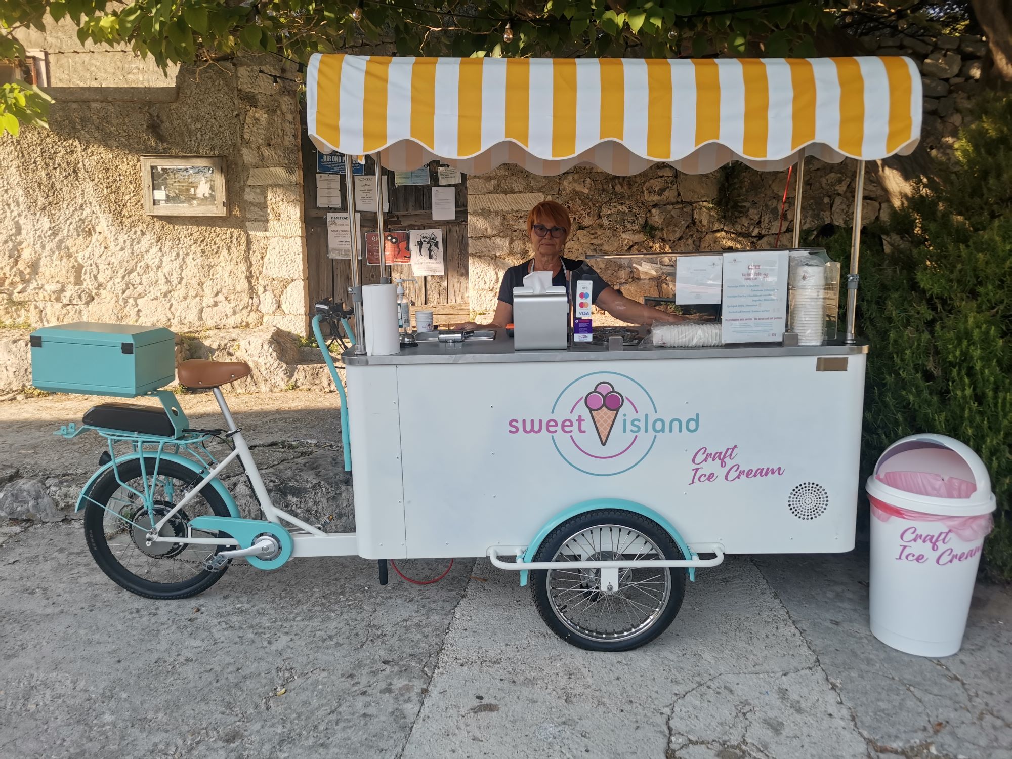 Osim rada, vrijeme posvećuje i svojim mačkama, njih četiri, a svako jutro počinje s jogom. Helena je na otoku poznata i kao zimska kupačica koja kupanje u moru ne propušta ni na ožujskim burama. Radit će u sezonama, kaže, dok će fizički moći. A kako izgleda prodaja domaćeg sladoleda u triciklu, pogledajte u galeriji ispod teksta.