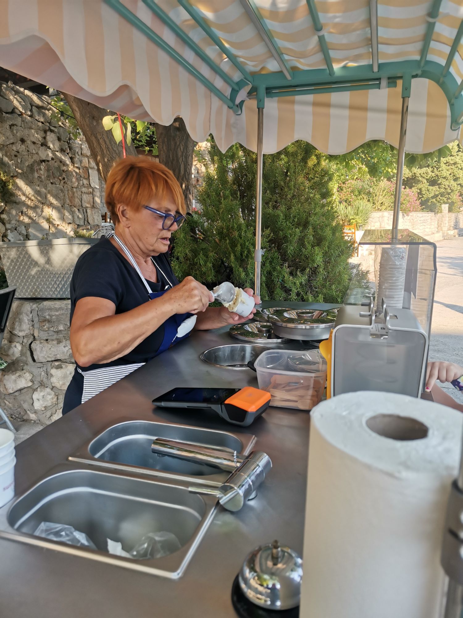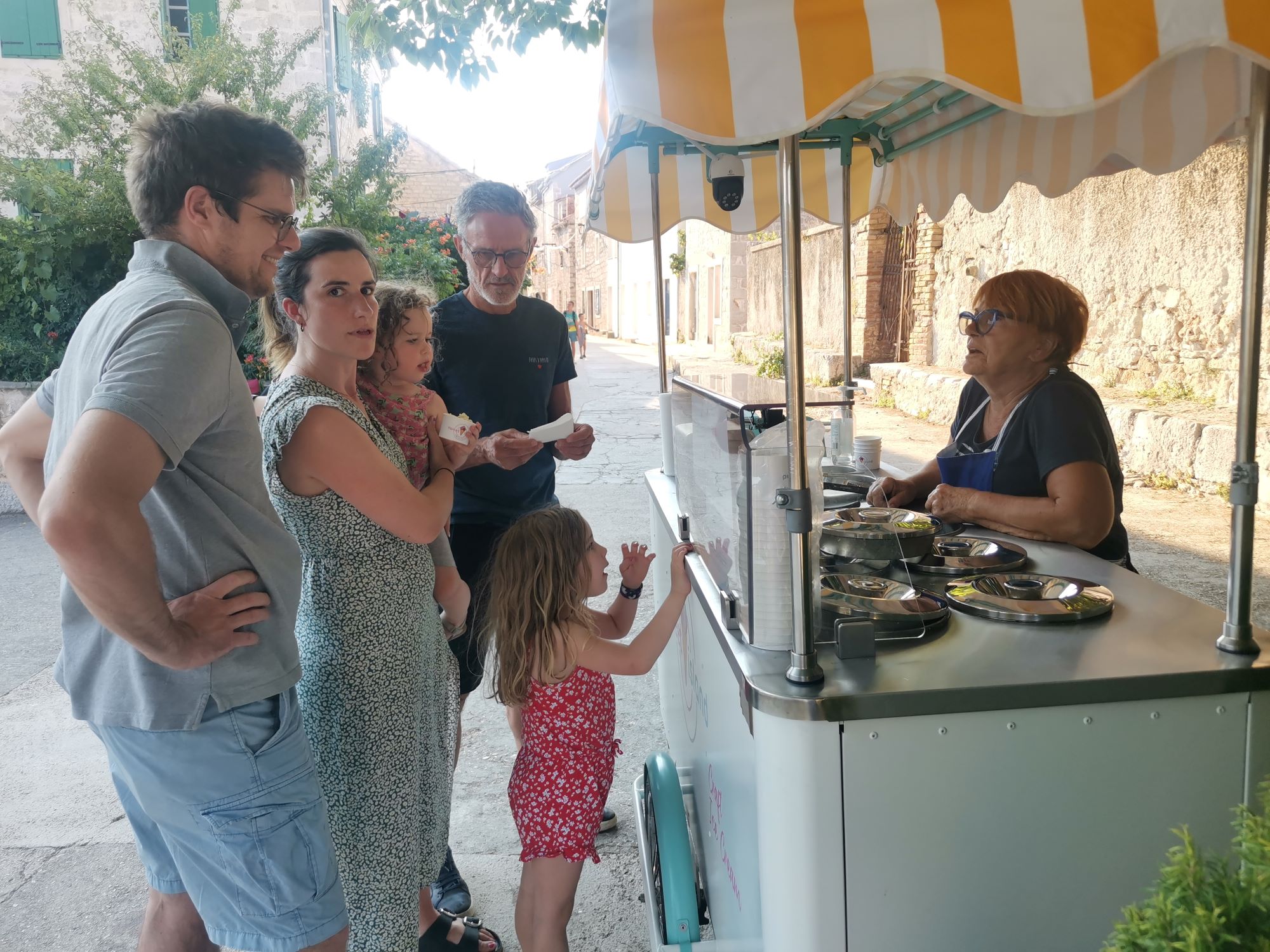 Za šest sladolednih okusa u hladovini ispod dudove krošnje zadužena je 72-godišnja umirovljenica Helena Falco. Rad u mirovini donosi joj dodatni prihod, ali i kontakt s ljudima. Retro tricikl čija škrinja skriva domaće, ručno rađene sladolede, od ovoga ljeta krasi glavnu ulicu otoka Prvića u šibenskom arhipelagu.