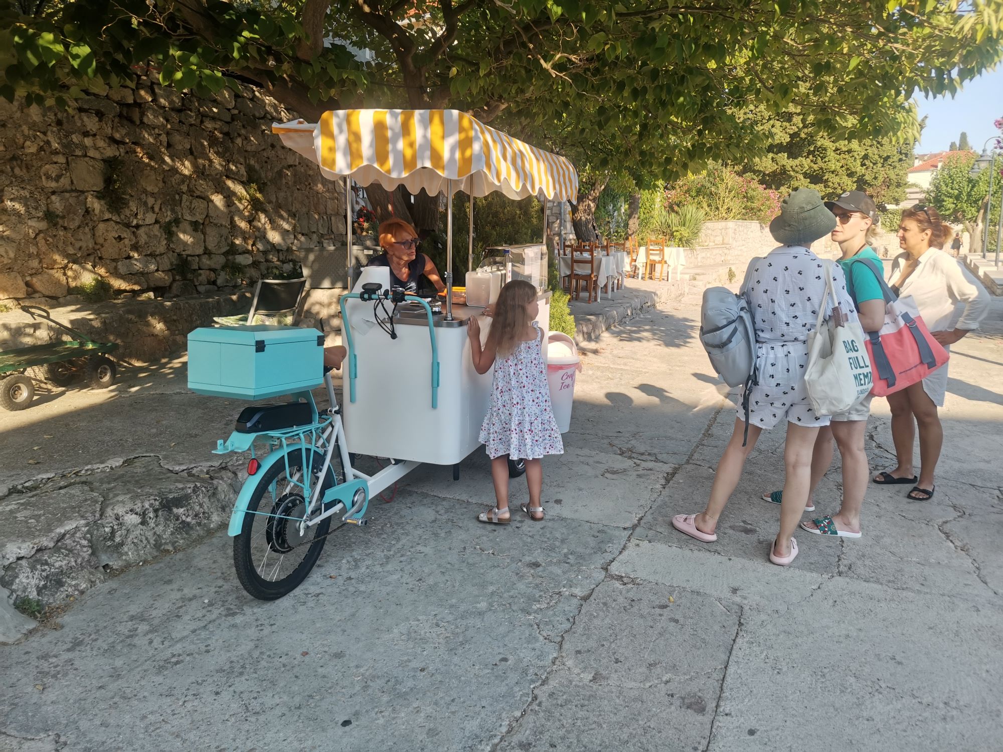 Osim rada, vrijeme posvećuje i svojim mačkama, njih četiri, a svako jutro počinje s jogom. Helena je na otoku poznata i kao zimska kupačica koja kupanje u moru ne propušta ni na ožujskim burama. Radit će u sezonama, kaže, dok će fizički moći. A kako izgleda prodaja domaćeg sladoleda u triciklu, pogledajte u galeriji ispod teksta.
