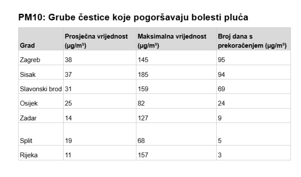 Fine čestice PM2.5 smatraju se najopasnijima, jer ulaze u krvotok i uzrokuju dugotrajna oštećenja respiratornog i kardiovaskularnog sustava. U Zagrebu, Sisku i Slavonskom Brodu građani su tijekom godine imali više od 170 do čak 196 dana s prekoračenjem PM2.5. To znači da gotovo svaki drugi dan u godini udišu opasan zrak. Rijeka, s 12 dana prekoračenja, stoji najbolje, ali čak je i to trostruko više od WHO dopuštenog maksimuma.